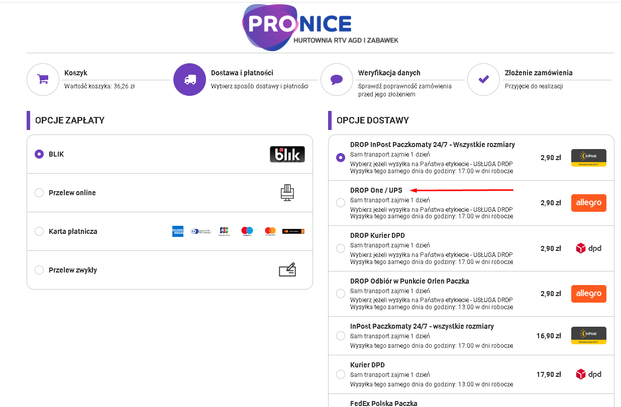 Allegro One -> Tutaj jest możliwość wysyłki tylko na Państwa etykietach (dropshipping). Nie ma możliwości wygenerowania kuriera z naszej strony. Koszt wysyłki na Państwa etykiecie to 2,90zł brutto do kwoty 50 zł. Powyżej 50 zł, usługa pakowania jest darmowa.