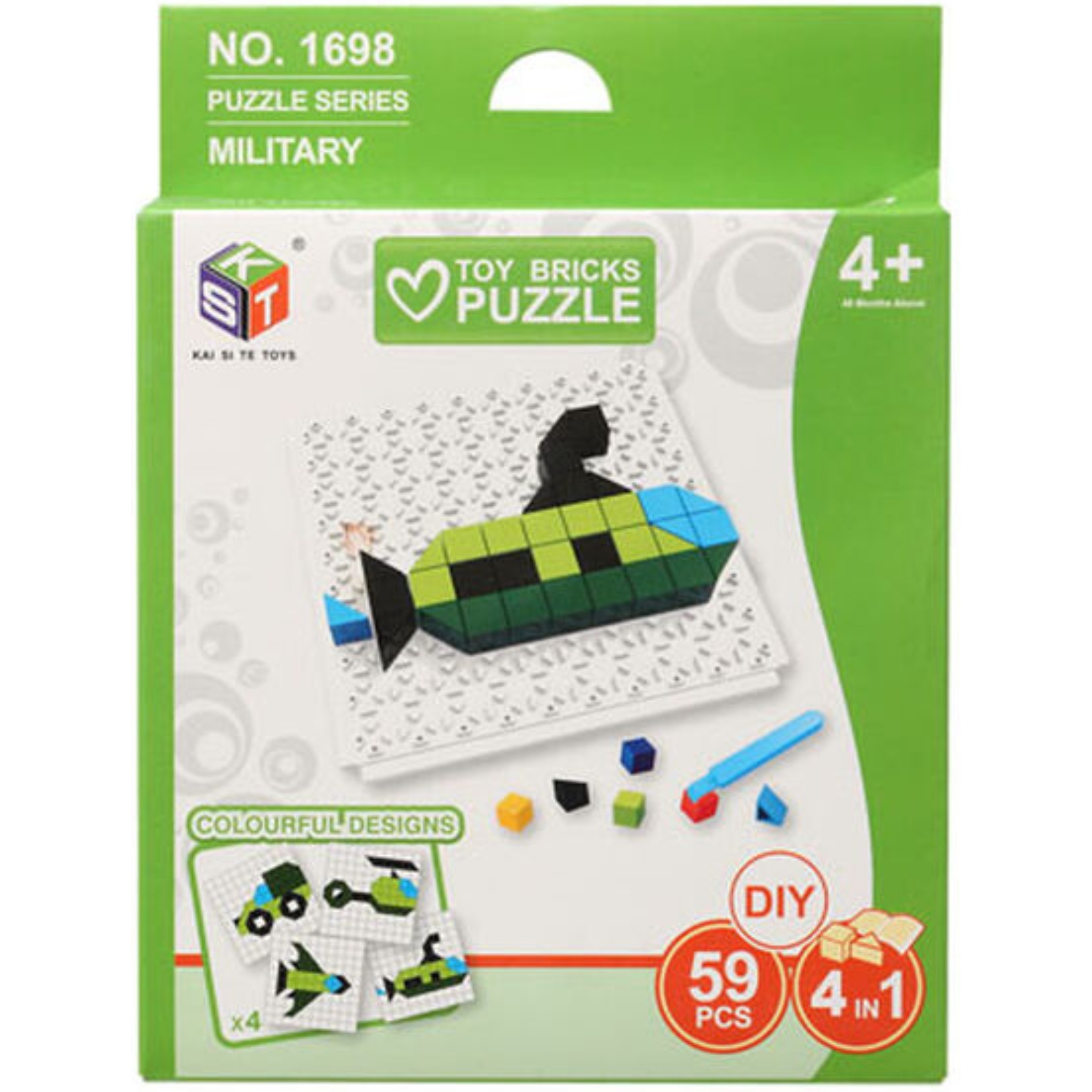 ⭐ Klocki - puzzle: Zestaw zawiera 59 klocków w 4 inspirujących kolorach - jasnozielony, ciemnozielony, czarny, niebieski. Te różnorodne barwy inspirowane są pojazdami militarnymi. Kolory pobudzają wyobraźnię dziecka i inspirują do tworzenia różnorodnych obrazów. Klocki mają kształty trójkątów i kwadratów, co pozwala na zaznajomienie się z pierwszymi figurami geometrycznymi i łatwe tworzenie obrazków.