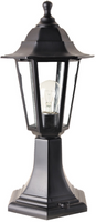 Lampa o podstawie równoległoboku z przeszkloną częścią na żarówkę i klasycznym zadaszeniu.